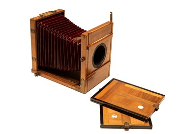 This 18x23 cm wooden camera comes with its case (with signs of use) and 2 orig...