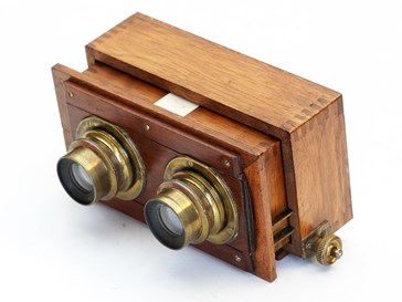 The unique camera in this auction is a beautiful and very well-made wooden stereo camera...